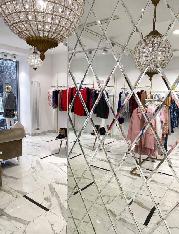 Использована серебристая квадратная зеркальная плитка размером 18х18.
